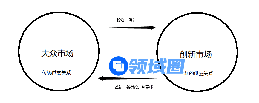 如图所示,能在成熟大众市场有稳定收入的企业,通过天使投资、建设孵化器等方式来对尚不成熟的创新市场进行“输血供养”,而创新市场通过令自己范式走向成熟并完成对市场的驯化来为旧的大众市场做产业升级,随着时间的推移,创新市场将逐渐变为大众市场。比如制作传统PC和主机游戏的大型厂商A,在智能手机尚未普及的年代通过天使投资和提供孵化器办公场地扶持手机游戏开发商B,随着智能手机普及程度的上升,手机游戏玩家人数激增,B的产品在未来某一日也有了极高的市场占有率。在这个例子中,你把A换成“传统视频网站”,把B换成“直播平台”或者“短视频公司”代入也没有问题(虽说传统视频网站这么多年也存在比较大的变现问题)。