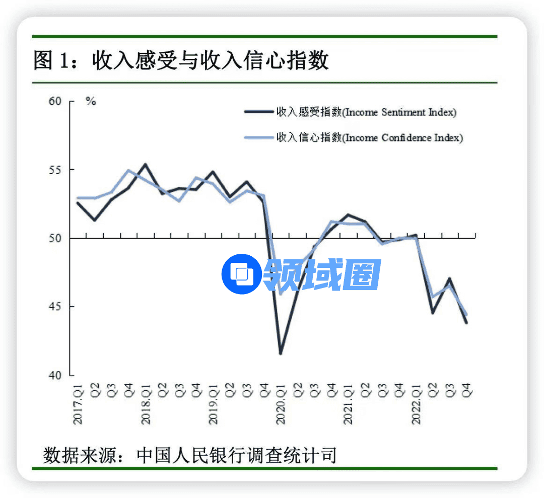 首先是近年来大多数民众一方面认为自己的经济收入有所下降,另一方面他们对未来自己收入的预期总体也处于一个比较悲观的态度,下图是一份来自中国人民银行调查统计司关于国内“收入感受”与“收入信心指数”的一份数据,你可以很明显地观察到进入2019年之后整个曲线就出现了明显的下降态势,而那一年是病毒尚未在全球大规模肆虐的一年,所以多数民众对未来的悲观并不完全源于病毒。