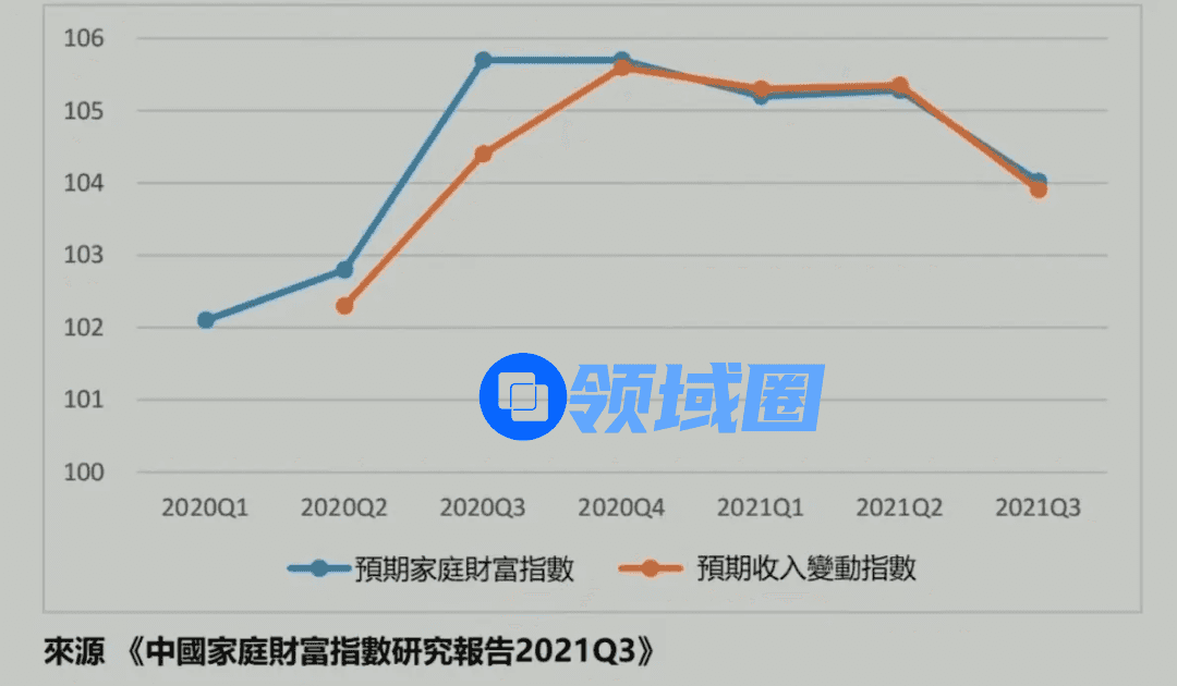 另外一份由西南财经大学所统计的2020年到2021年第三季度的“中国家庭财富指数研究报告”中的“预期家庭财富指数”和“预期收入变动指数”也基本和上图能够对应得上。