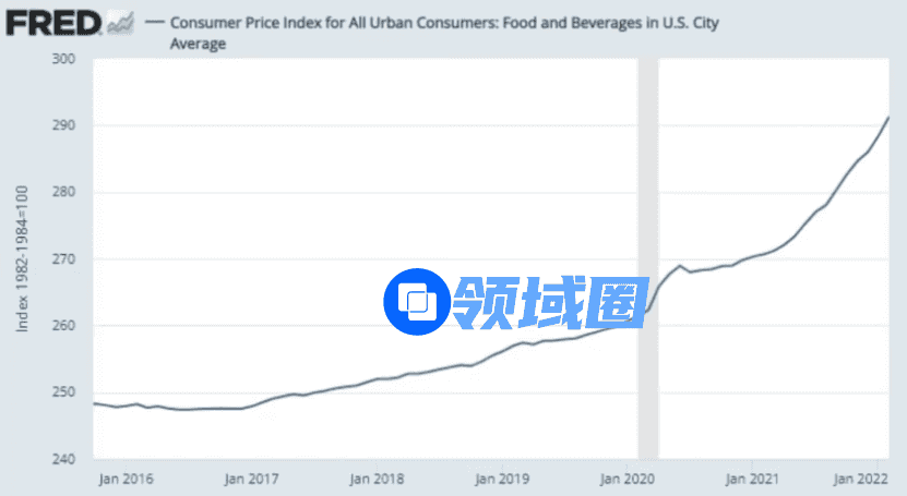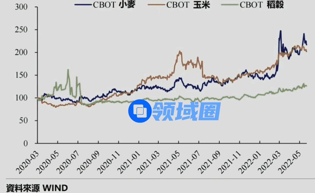 办公场地和软硬件设备的成本上升往源头方面追溯可以一直追溯到“粮食”和“能源”2方面的价格上升。如图所示,上面是美国劳工统计局发布的食物和饮料价格数据,下图则是芝加哥期货交易所发布的小麦、玉米和稻谷价格数据。