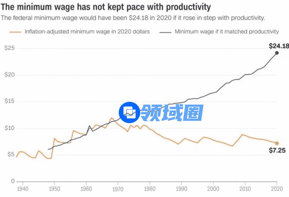 为什么我是用比较肯定的语气来说“几乎所有的游戏公司”(甚至是所有的公司)对员工进行的都是“被动加薪”呢?各位可以简单来看一下下面的这张图,你可以看到在2020年的时候,美国的最低时薪为7.25美元,但如果完整地考虑通胀因素的话,理论上最低时薪应该是24.18美元,二者之间相差如此之大你自然能够理解何为“被动加薪”了。