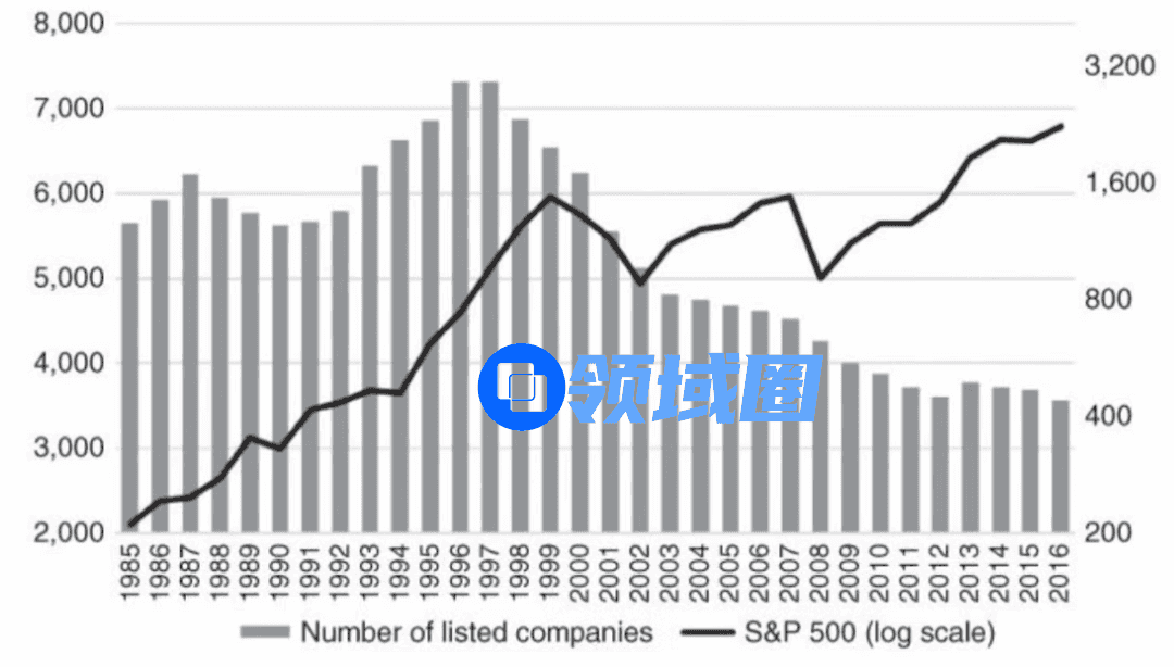这样的问题不仅仅会出现在国内,只要是身处现代文明社会的初创公司领导团队都需要面对类似的问题,而且基本上“并购”泛滥的趋势是不可被阻挡的。如下图所示我们可以看到从1998年开始,在美上市公司的数量在逐步下降,但上市公司的总市值却在不断上升。