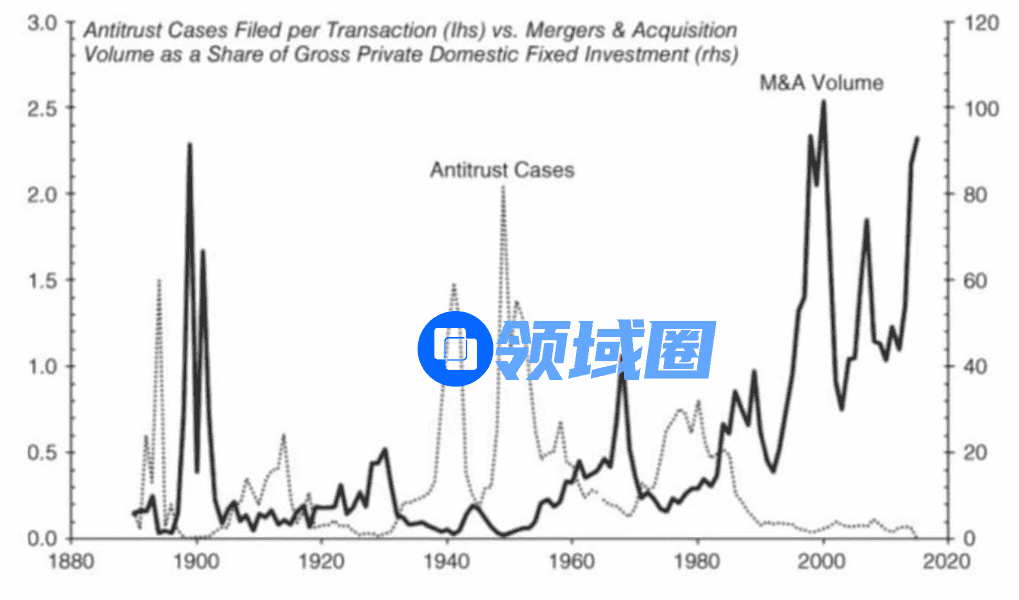 另外还有下图也提供了一些可供参考的数据,图中实线代表的是全美并购案的发生次数,而虚线则代表了全美反垄断法的动用次数。可以看到,在上世纪八十年代之后,全美的并购案数量总体呈现上升态势,而反垄断法的动用次数却在逐渐下降。如果说任何领域创业都是一种“九死一生”的行为,那么在创业初步成功之后依旧无法保住自己的企业同样是一件令人悲伤的事情。