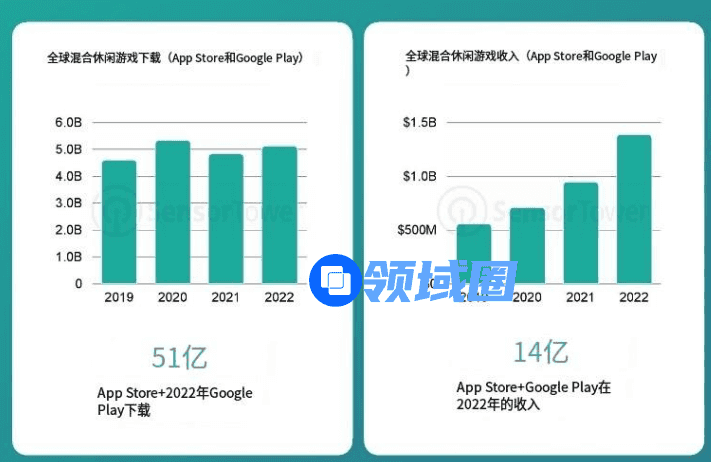 得益于以上种种优势,全球混合休闲游戏市场的玩家和收入规模至今仍在稳步增长。据Sensor Tower发布的《2023手机游戏报告》,2022年混合休闲游戏下载量超过51亿(App Store + Google Play数据),同比增长3%,同时收入猛增,相较于2020年近乎翻倍,达到了14亿美元。