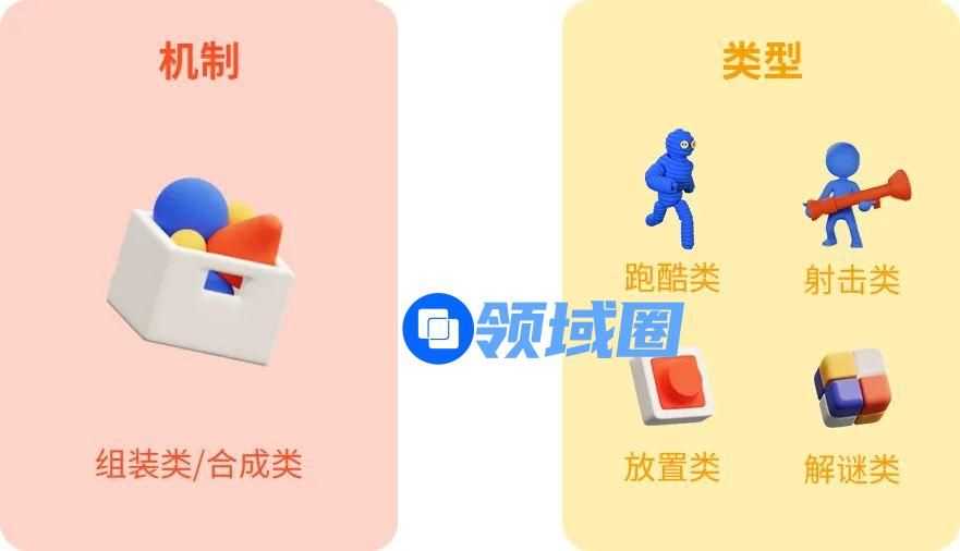 为此,Supersonic提出了成功率较高的“吸金组合公式”。这些吸金公式包含机制和类型两个模块,其中机制包括组装类和合成类,类型有跑酷类、射击类、解谜类和放置类四大类别。组装和合成两大玩法机制拥有极强的扩展性和适配性,开发者只需要将机制与玩法进行组合,就能在选定的题材基础上构建出一个比较完整的玩法逻辑。