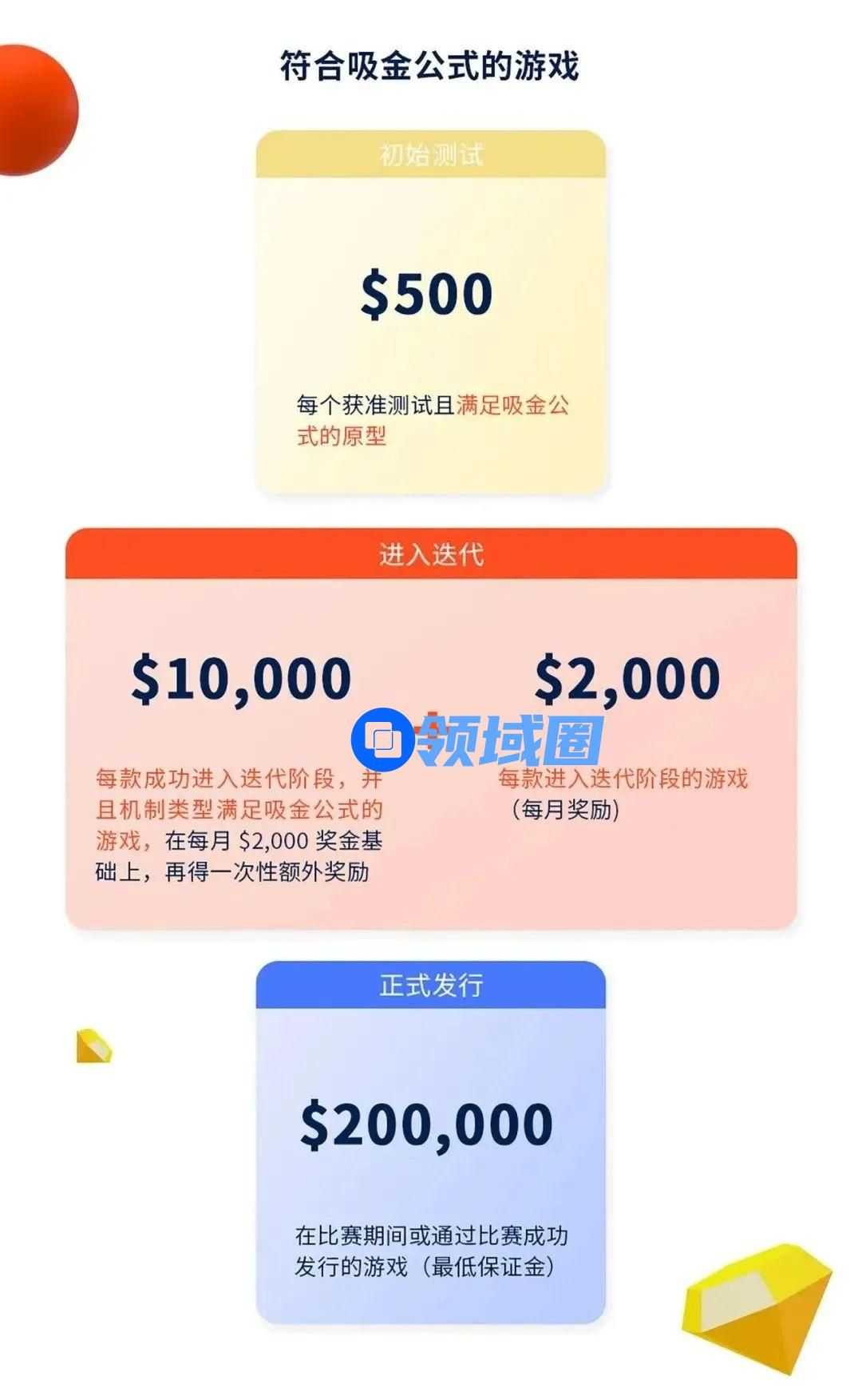 此前没有在Supersonic平台上进行过测试,且下载量少于1万的混合休闲游戏,都可以参与这次活动(每个开发者最多可测试 5 款游戏)。只要参赛产品成功进入初始测试、产品迭代和正式发行阶段,开发者就能够获得对应的现金激励,每款游戏最多可以让开发者获得累积超20万美金,其中符合吸金公式的产品还将获得更多额外奖励。