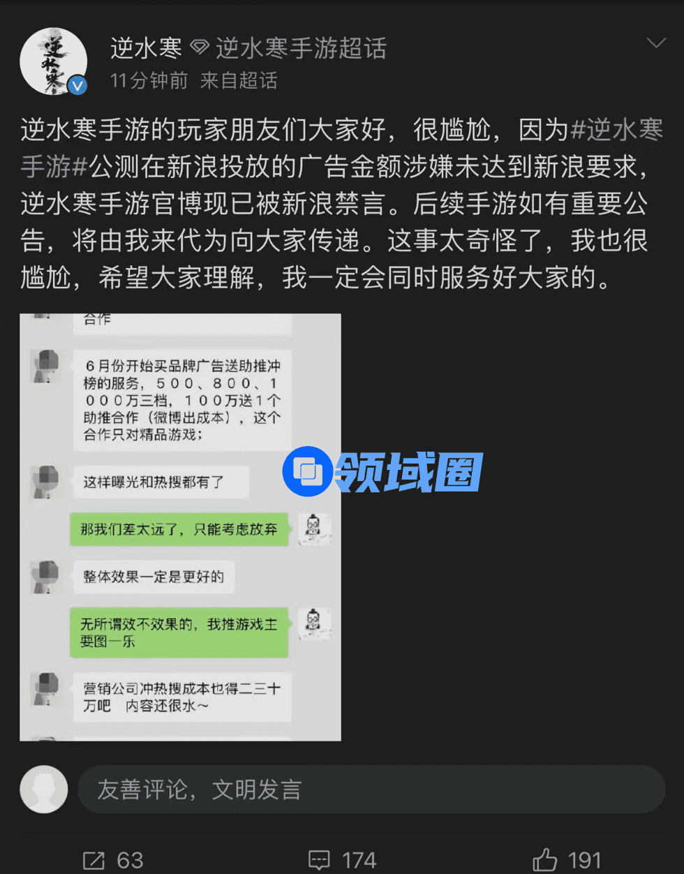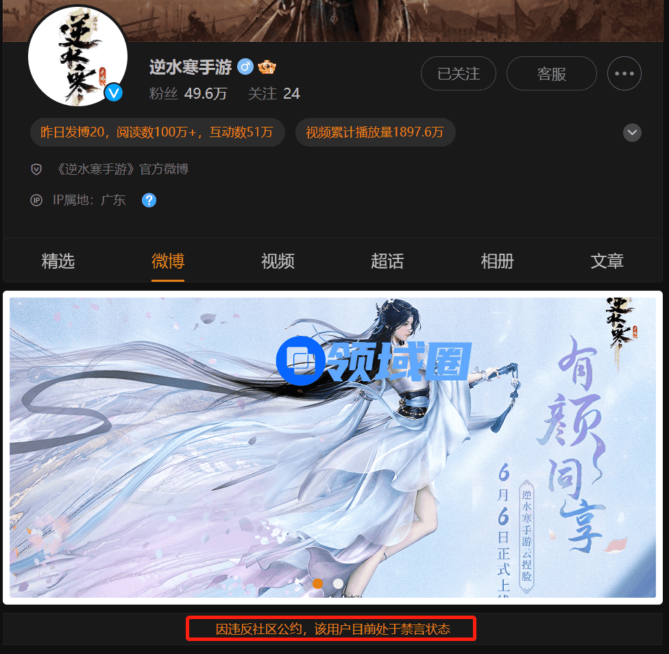 随后,逆水寒(端游)官方发布微博称,“因为逆水寒手游公测在某浪投放的广告金额涉嫌未达到某浪要求,逆水寒手游官博现已被某浪禁言。”