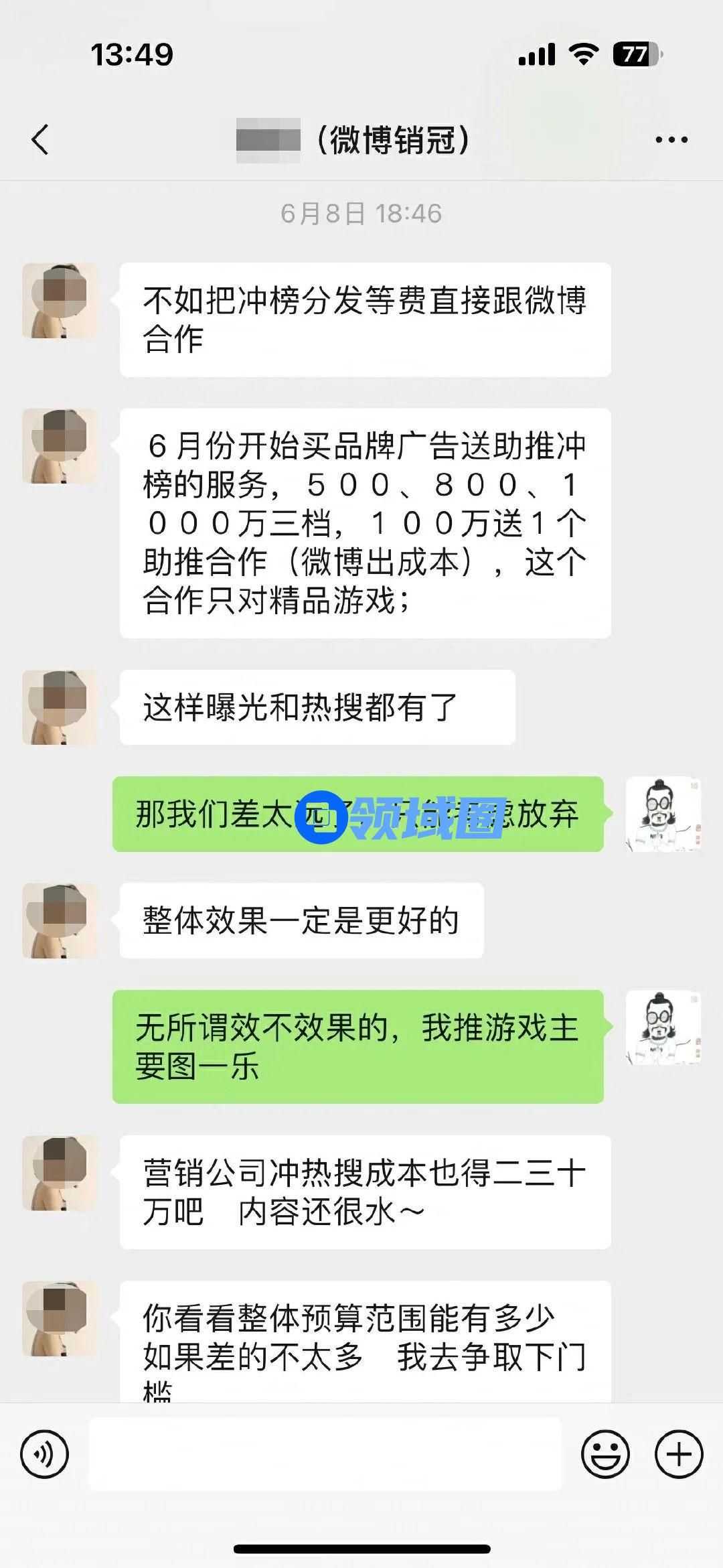 逆水寒官博同时附上游戏官方工作人员与某浪某销售人员的微信聊天截图。某博工作人员表示,“冲榜的服务分500、800、1000万三档……这样曝光和热搜都有了”,但遭到了逆水寒手游工作人员的拒绝。