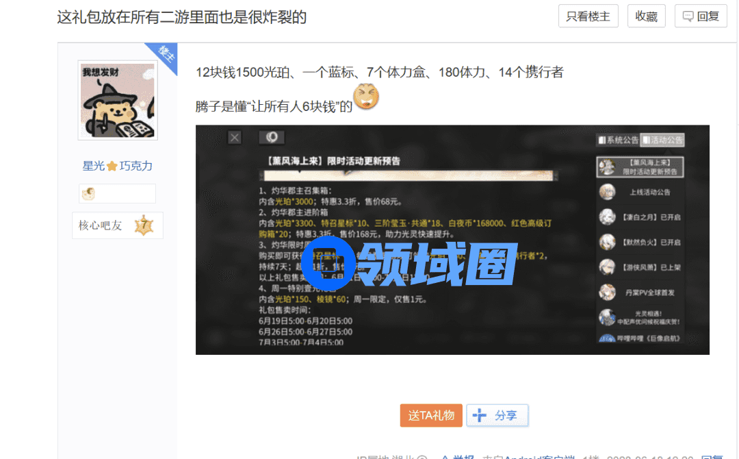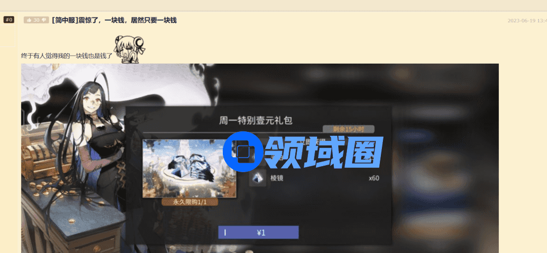 你以为这就完了?如果说9块钱的礼包还讲一些武德,那与9块钱周卡同期上线1块钱礼包就真的有点“不当人”了。该礼包周一限定购买,等价0.5抽的资源并附赠60体力,国服玩家将其戏称为“疯狂星期一”。