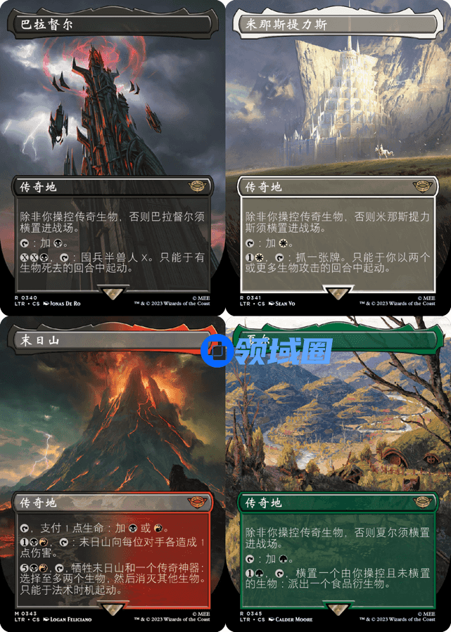 不仅如此,你还能在本系列中找到《魔戒》故事的诸多剪影。将一些无边框卡牌组合起来,原著的经典场景会悄然出现在你的面前,例如下面这组牌就展示了至尊戒毁灭的前一瞬。