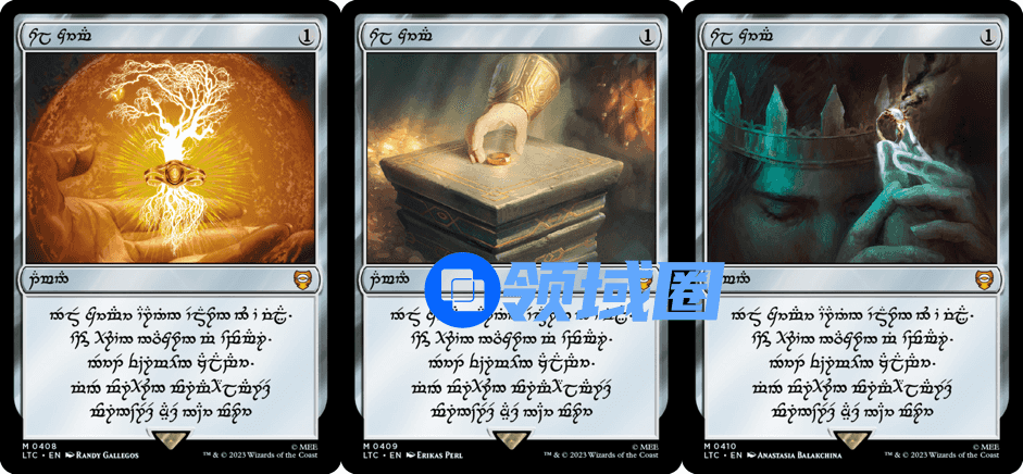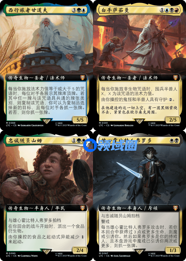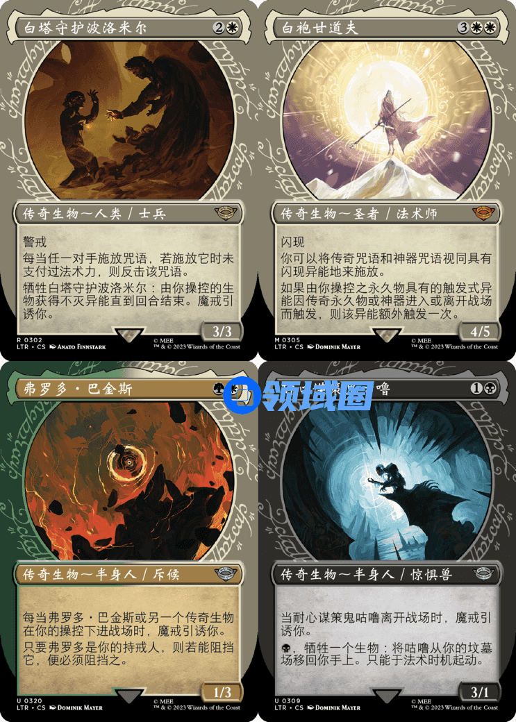 《魔戒》原著引人入胜的亮点之一,就是展现了各种角色在遭受至尊戒引诱下的不同表现。万智牌将至尊戒对角色们的影响,通过不同的牌框展现了出来。设计团队经过仔细研究,最终选出了30位魔戒中传奇角色成为万智牌中的“传奇生物”,他们的行为和动机或多或少地受到过至尊戒力量的影响。这些牌拥有全新的插画和独特的牌框,旨在凸显这30位代表人物的不同性格特点。