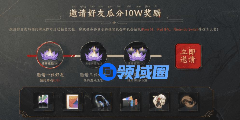 自6月20日12:00起,至7月19日23:59,玩家通过【西行集结】活动,预约游戏并完成相应的邀请任务即可获得抽奖次数,邀请成功必得6连抽。奖池包括iPad、iPhone14、Nintendo Switch、100元京东卡等诸多价值不菲的实物好礼!西行锦鲤加持,你还有机会获得100连抽的机会,一次性将所有奖励统统拿走。你怎么知道这个锦鲤不是你呢?