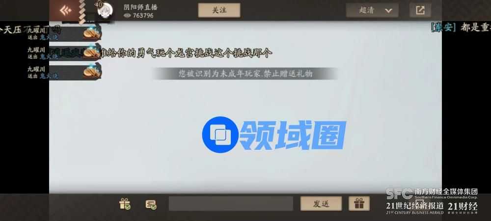 (《阴阳师》内置的直播模块,未成年用户被限制为不可向主播赠送礼物)