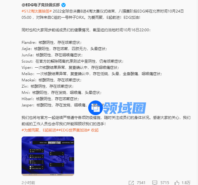 与RNG一起出征LPL一号种子JDG与三号种子EDG同样情况不妙,在RNG官宣全员新冠感染后,EDG与JDG各自也传来噩耗。JDG的核心选手中单Yagao核酸结果呈阳性,存在发烧咳嗽等症状,而EDG则是选手到教练再到BP分析师,无一幸免。