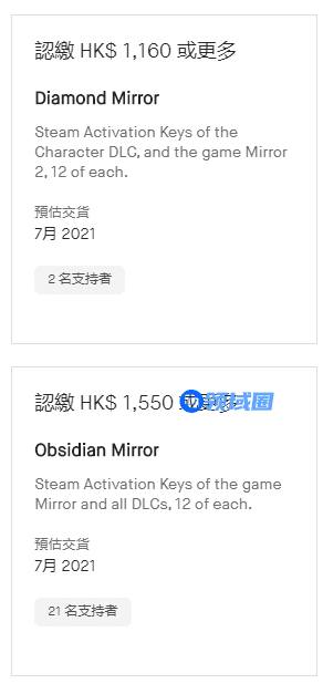 不过《Mirror2》的众筹显然遵循了“众生平等”的原则,最高级别的1550港元“Obsidian Mirror”其奖励不过区区12个全DLC激活码,按照现在100港元的均价,买了这个级别的玩家甚至还亏350港元。而低一档仅需1160港元的“Diamond Mirror”居然设置了同样的奖励。