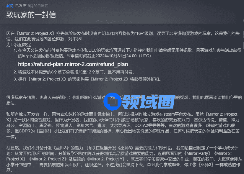 最终,所有的矛盾在9月底一触即发。官方发布了名为“致玩家的一封信”公告,其中明确表示《Mirror 2: Project X》是一款16+游戏,彻底葬送了这是一款18+“黄油”的谣言。