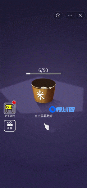 该游戏主界面十分简洁,只有一个米缸和一个总目标为一亿的进度条,而玩家需要做的就是通过点击和放置,数出一亿粒米。