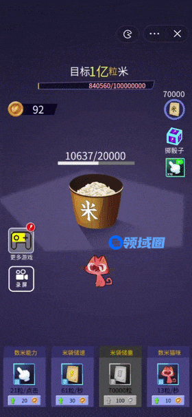 好在玩家还可以通过积累的金币,对数米能力进行升级,使单次点击的米粒数量得到提升,从而提升游戏的效率。当然,从1到10的变化,对于1亿的总目标来说仍旧不过杯水车薪。