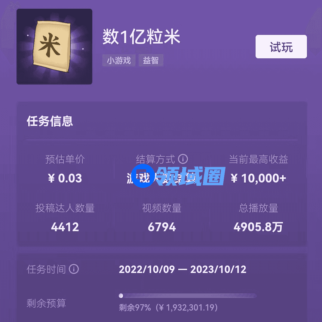 《数1亿粒米》在上线后,迅速登上抖音小游戏热门榜TOP3,目前,该游戏相关话题#数1亿粒米 在抖音站内的播放量累计突破了6500万,抖音发行人计划投稿视频数量超6000条,单条视频最高收益也已经超过了1万元。