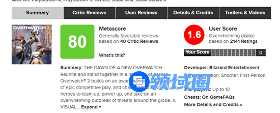 《守望先锋》“归来”目前在Metacretic上媒体平均分达到80/100分,算是一个非常不错的媒体评价。