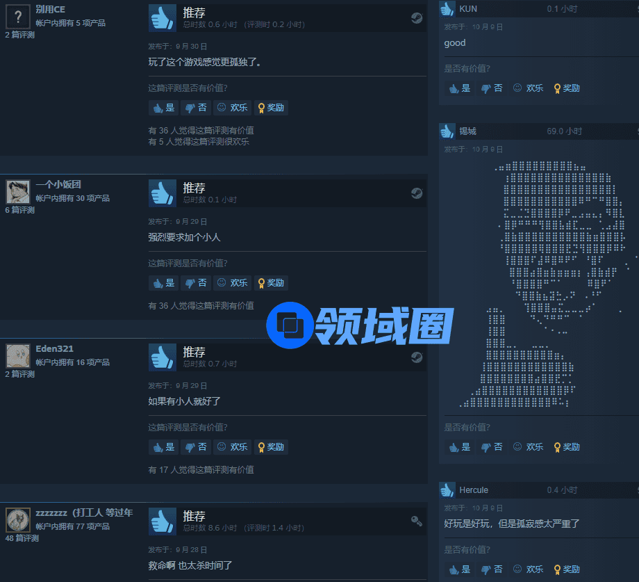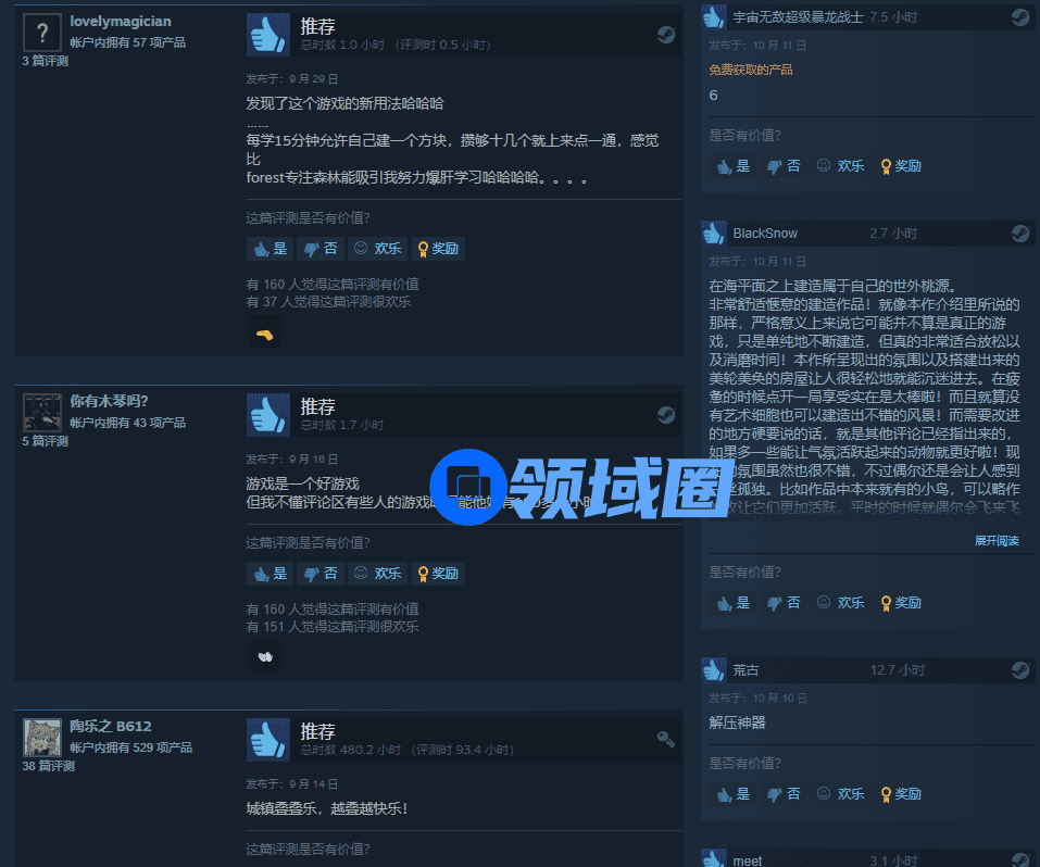 情绪上的放空,享受,本该是《城镇叠叠乐》带来的难得的正面反馈,但却有相当一部分玩家从中体会出了强烈的孤独感,这类评论的游戏时间通常都只有不到半小时,放空享受完全与孤寂感呈现了一体两面性,甚至有玩家深刻的剖析了这一情绪感知,“当你感到迷惘和空虚的时候,最好不要玩,咬咬牙继续努力往前走。”