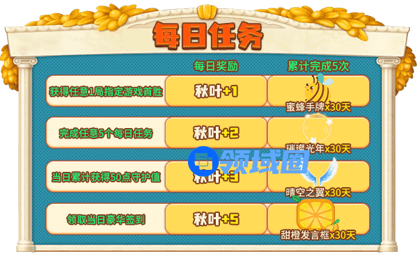 活动期间,新增每日额外任务,每完成一项任务,即可获得“秋叶”奖励!每项任务累计完成5次,还能领取额外奖励!