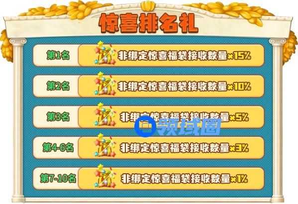 并且,按每个玩家累积接收的非绑定“惊喜福袋”数量进行排名,活动结束后为排行榜前10名玩家发放排名奖励!