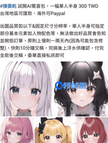 中国台湾的网友甚至开出300新台币(约67.5元)的高价承接各种动漫单人半身图片,接受各种口味的“私人定制”,最快10分钟出图,童叟无欺。