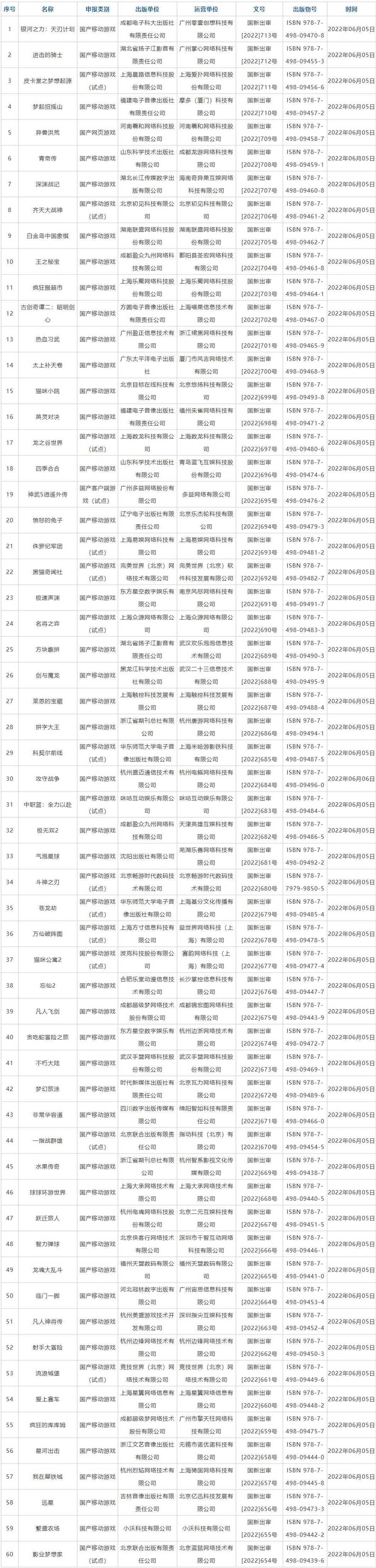 继2022年4月11日游戏版号恢复发放之后,时隔两月,今日(6月7日),国家新闻出版署网站公布最新的国产网络游戏审批信息,此次共有60款信息游戏获批。