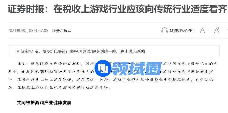 2021年时,伴随着互联网行业反垄断和游戏行业防沉迷整顿进行时,《证券时报》刊发一篇题为《在税收上游戏行业应该向传统行业适度看齐》的评论文章。文章中心思想指出:游戏行业作为软件服务业享受税收优惠,也受到诟病,在税收上游戏行业也应该向传统行业适度看齐。