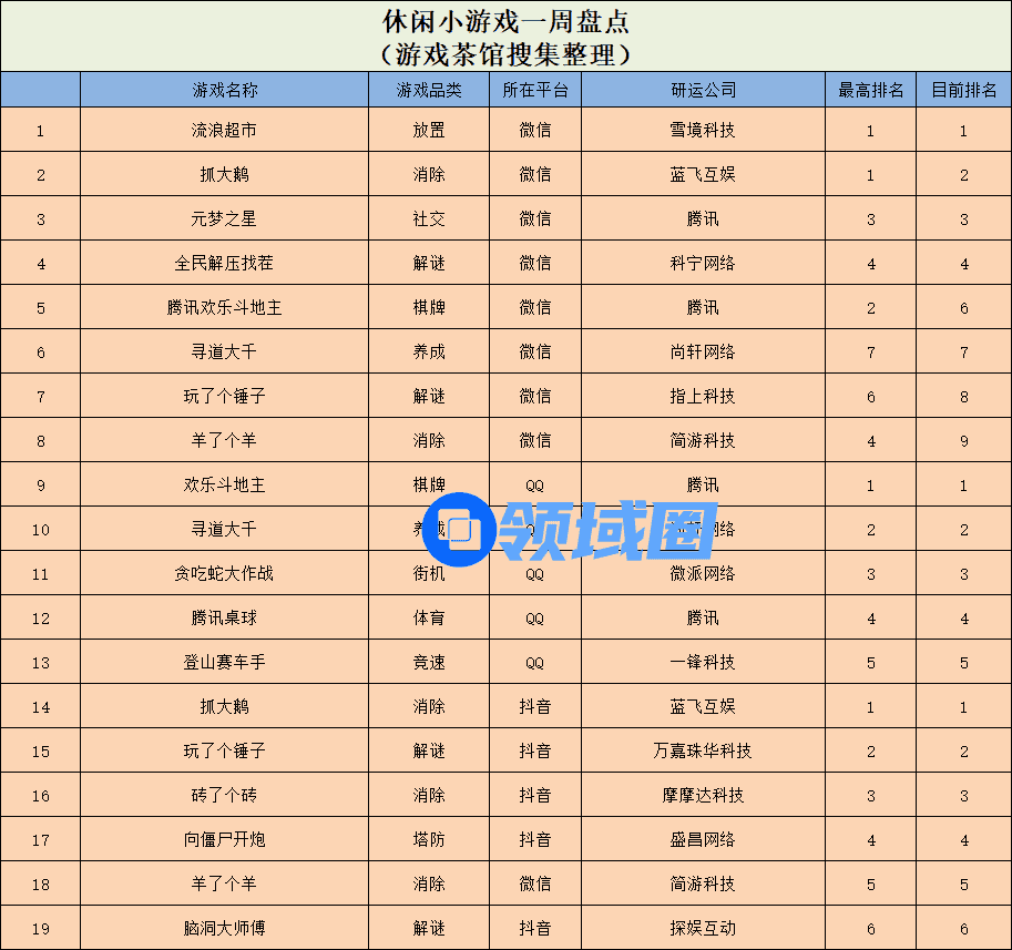 休闲新游周报每周统计微信小游戏、QQ小游戏、抖音小游戏、硬核小游戏以及App Store和Google Play上的新游爆款,并按照分类制作表格,将游戏排名情况等信息公布,希望给到行业同侪帮助。