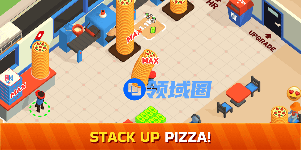 其中《Pizza Ready!》的玩法非常简单,玩家只需要通过滑动屏幕控制小人,制作并出售披萨获得收益,然后耗费金钱扩充店面,加速获得更多收益。