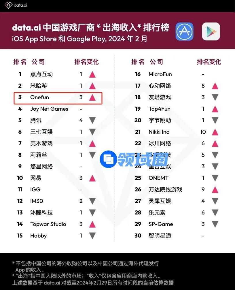 该游戏背后的厂商是北京元趣娱乐(OneFun)。得益于《Last War:Survival》的成功,元趣娱乐在今年2月份一举超过腾讯、三七互娱等头部大厂,冲上了国内厂商出海收入榜单的TOP3(榜单来源:data.ai)。
