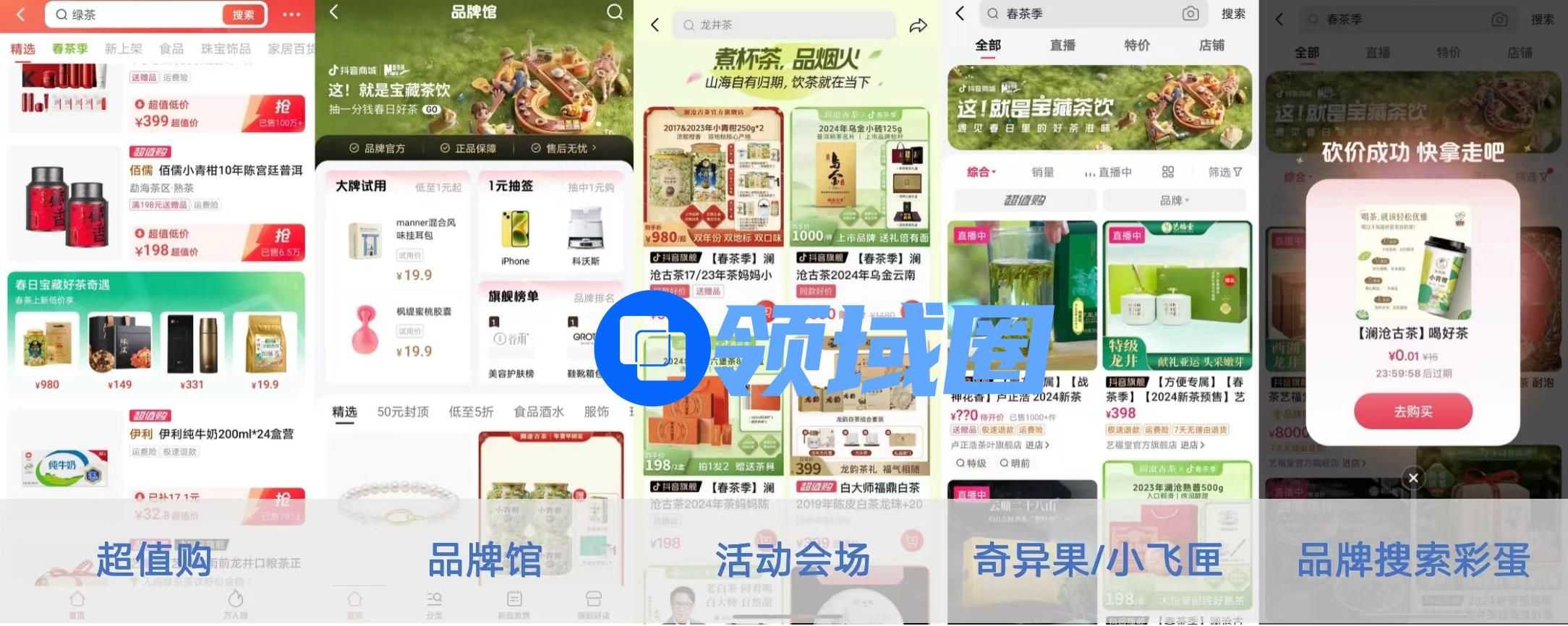 另一方面,抖音商城将品牌优选“明星产品”布局超值购、品牌馆、首页卡3、奇异果小飞匣、seo优化等,引流+搜索承接,提高货架场占比,让优惠界面一触即发,透传购买低价好物上抖音电商的消费心智。其中与澜沧古茶、白大师联动开启的“1分钱春茶”福利活动,海量茶样全网派送,随机彩蛋发放优惠券,不仅为用户拉低了消费成本,满足其高性价比需求,更能为品牌目标消费人群蓄水种草,促进商家销售转化。