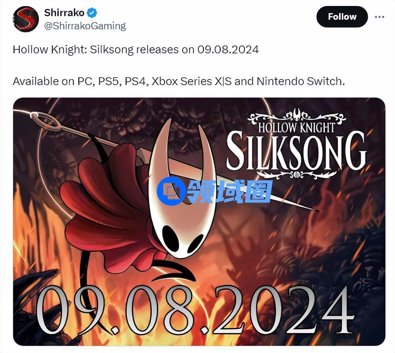 《空洞骑士:丝之歌》定档2024年9月8日!!!(如果是假的,我希望是真的,如果是真的,我希望今天是9月7日)