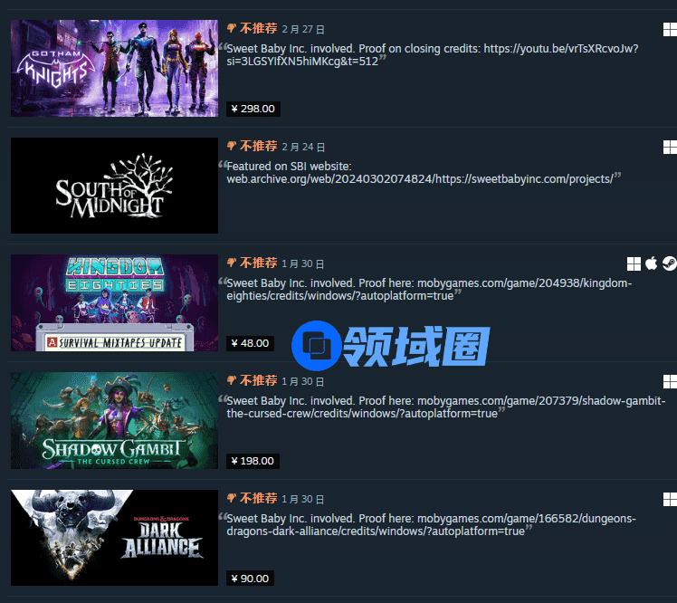 这份鉴赏家页面囊括的产品非常丰富,包括了知名度极高的《战神:诸神黄昏》《刺客信条:英灵殿》《漫威蜘蛛侠2》《哥谭骑士》《自杀小队》等等产品,而这些游戏无一例外都被Kabrutusrambo标记为“不推荐”,只因为这些游戏背后都有同一个公司——Sweet Baby Inc. (下称SBI)的参与。