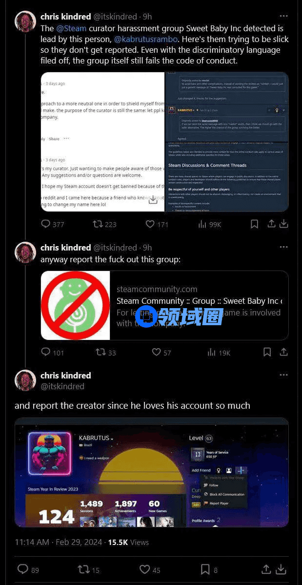 员工kinderd不废话直接输出,在X上狂发三条推文,并贴出鉴赏家页面的举报通道,一心只想要这个页面赶紧消失。发完想想又觉得不过瘾,连忙补充了页面创建者Kabrutusrambo的主页:既然他这么喜欢他的账号,那么就让他的Steam账号一起拜拜吧。