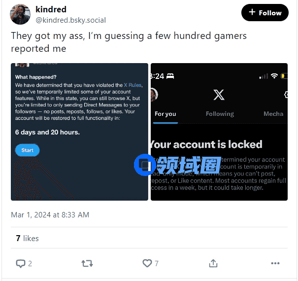 结果事与愿违,不到一天的时间,kinderd自己的X账号就被苦政治正确久矣的玩家冲没了。kinderd在BlueSky上抱怨道,由于遭到大量用户的举报,他的X账号将被封禁七天。