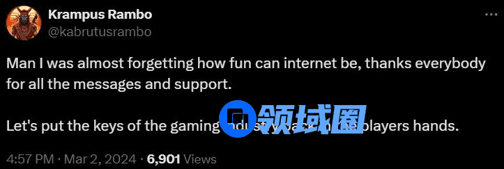 Kabrutusrambo随即发表推文对支持他的玩家表示了感谢,并表示:让我们把游戏产业的钥匙还到玩家手中吧。