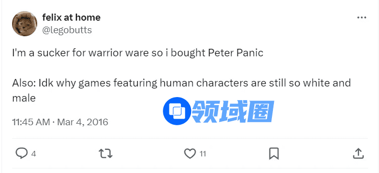 2016年,Kramer还在抱怨:我非常喜欢武士游戏,所以购买了《Perter Panic》,不过,我不知道为什么以人类为主角的游戏依然如此白人化和男性化。