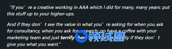 最离谱的是,为了让更多团队选择与SBI合作,Belair甚至会鼓励3A游戏公司员工威胁他们的营销团队:“如果他们不在乎你提出的建议,你可以和营销团队喝一杯咖啡,告诉他们如果不这样做(推动游戏内容多样性)可能会发生什么,来吓唬他们(terrify them)。”
