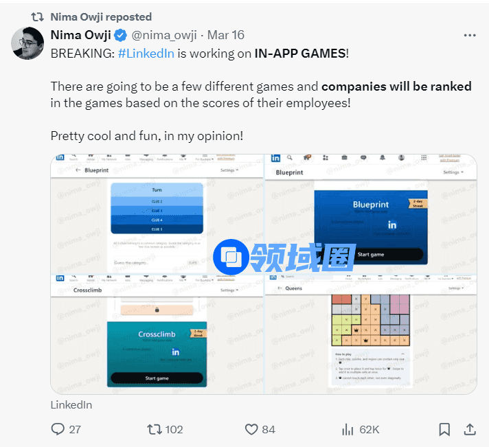 应用研究人员 Nima Owji 发现领英正在开发一些游戏,随后其在“黑叉”上分享了领英游戏页面的截图信息。