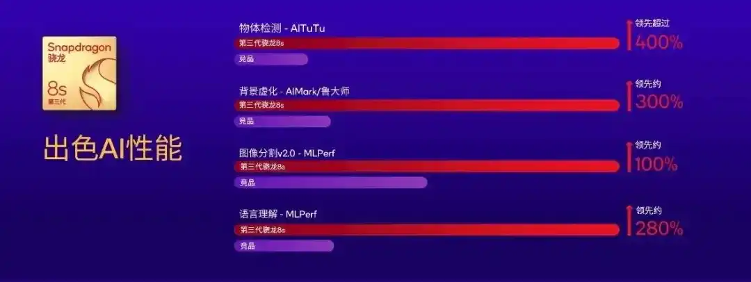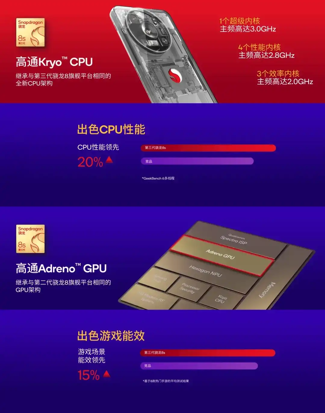 基本上,现在大家只要看到「骁龙 8」的标签,基本已经和「旗舰、顶级性能、AI 新特性」这些关键词深度绑定。 自骁龙 8 系诞生开始,几乎每款新发布的旗舰手机,都不断增加着令人惊奇的 AI 新特性。在影像、游戏、无线连接、音频等用户感知最为直观的方面,也都携手实现了跨越式的升级。 新生代的第三代骁龙 8s,有了新的任务 如果说第三代骁龙 8 的问世,是助力手机厂商一同完成了 AI 手机从无到有的突破。那新推出的第三代骁龙 8s,肩负着将生成式 AI 应用进一步带向大众的重任。第三代骁龙 8s 继承了与第三代骁龙 8 旗舰平台相同的 CPU 架构,并同样搭载最新的 Hexagon NPU 神经网络处理器,在 AI 的性能表现上同样保持了旗舰高水准。这意味着手机厂商可以为更多定位不同的机型,配备尖端的生成式 AI 能力,真正实现生成式 AI 应用的进一步普及。