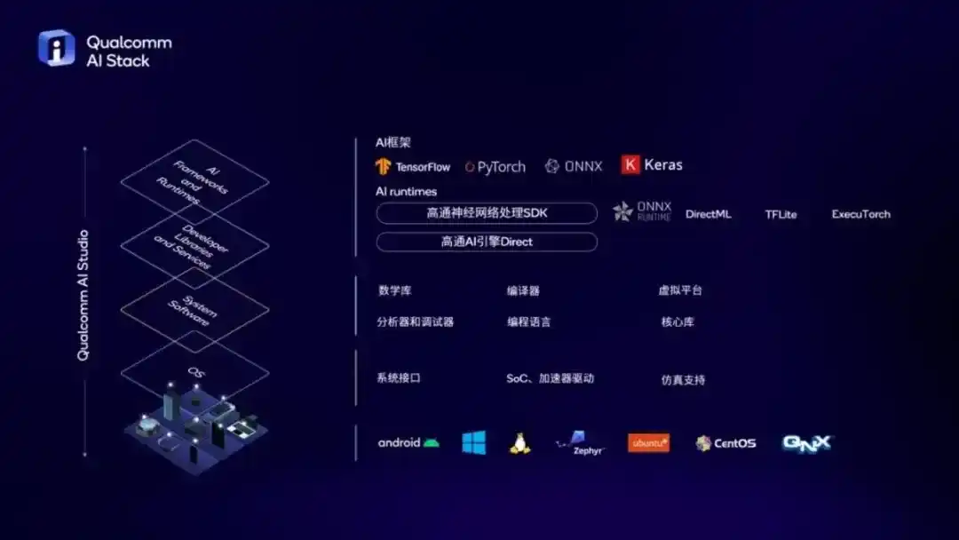目前高通正在加速 AI 生态的爆发。而这个加速绝不只是在硬件层面:对于开发者而言,高通 AI Stack 和 AI Hub 的推出也极大地降低了 AI 开发的门槛。这两个功能强大的 AI 开放平台,不仅集成了自然语言处理、语音识别、计算机视觉等多个领域的 AI 能力,也包含了全面优化的生成式 AI 大语言模型库。 开发者不用再把精力消耗在各个设备平台的适配以及繁琐的 AI 性能调度上。开发者可以简单高效地在骁龙和高通平台上进行部署,借助高通 AI Hub 提供统一的开发框架和工具链,通过 NPU 等专用硬件和异构计算架构实现高性能、低功耗的 AI 计算。 简单来说,未来的软件开发者,只需要几行代码就可以玩转 AI 大模型,而不同设备的适配也简单省心,节省了大量时间和工作量,快速灵活地打造自己独特的产品。而手机厂商也能更专注于创造属于 AI 时代的全新的交互方式,同时不必受限于算力、功耗、各个传感器调度协作等问题。