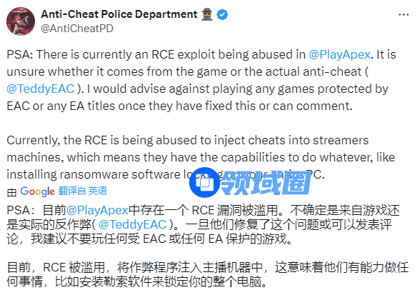 海外反作弊团队在X上透露,黑客可能通过游戏或者EAC反作弊系统的漏洞来入侵选手的客户端,他们还呼吁玩家停止游玩使用EA旗下的或者是使用EAC的游戏,直到官方宣布修复。