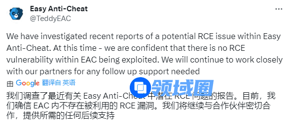目前,EAC的开发商在X上回应,他们经过了调查,没有发现EAC中存在会被远程代码利用的漏洞,如果选手同意,EAC可以通过对选手电脑进行彻底分析来找出问题所在。