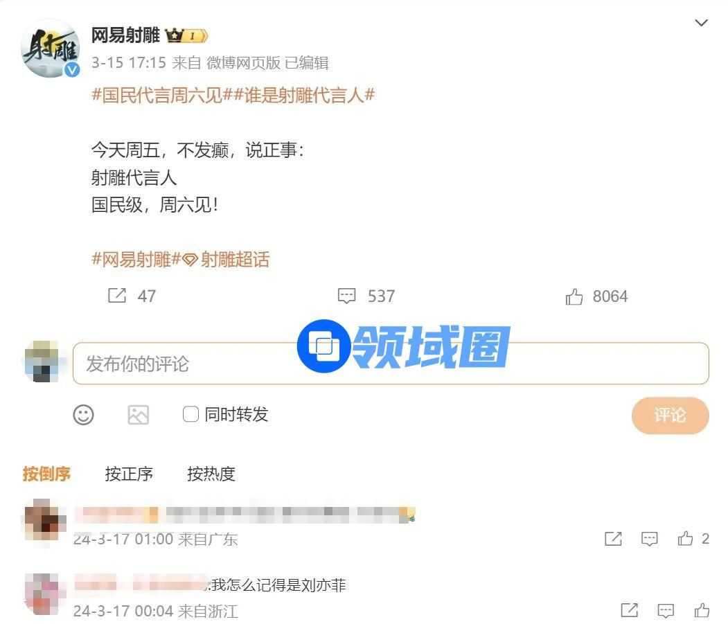 这你以为就完了?上周五,《射雕》官微表示“今天不发癫,明天公布代言人”,还特别强调是国民级,引发网友一阵讨论,为喜欢的明星站台。就在大家热议是神仙姐姐刘亦菲还是不老男神苏有朋的时候,网易再次不按套路出牌,16日直接丢出一对“王炸”,正式宣布将《射雕》三部曲中的知名虚拟女神“黄蓉”作为唯一代言人,让吃瓜的玩家一脸懵逼,居然还能这么玩?
