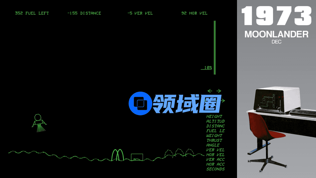 严格来讲,《登月者》并不是一款游戏,它只是一款用于演示GT40监视器性能的程序而已,玩法也很简单,控制一艘登陆器在月球上安全落地。但不知道是不是登月者的程序员很喜欢吃汉堡,当登陆器降落在某个场景时,屏幕上会出现一家——麦当劳?