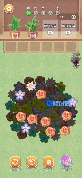 其中《爱上叠叠叠》是一款三消游戏,在每一个关卡中,主界面堆积了大量的花朵,玩家需要根据左上角的花盆,将对应颜色的花朵放入花盆,集齐三朵即可消除并获得一个新花盆,当玩家将界面中的所有花朵全部消除,即可通过关卡,同时解锁并收集一个新的花束。