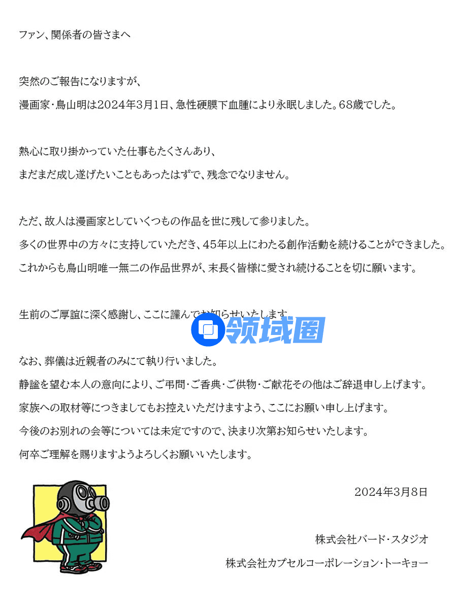 今日(3月8日)据外媒消息,著有《龙珠》《阿拉蕾》《沙漠大冒险》等作品,在全球享誉盛名的日本传奇漫画家鸟山明因急性硬膜下血肿于2024年3月1日去世,享年68岁。